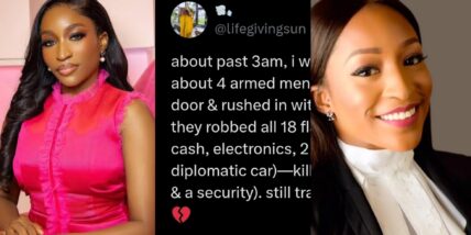 Sharing aftermath of the incident, she stated, “They robbed all 18 flats in my buildin, cash, electronics, 2 cars (1 being a diplomatic car)—killed 2 people (sommie & a security). still traumatized & in shock 💔”.