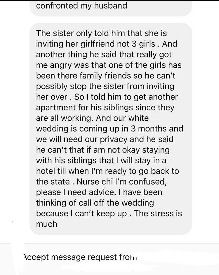 “I got married last year traditionally and court wedding was done too, I left Nigeria after 2weeks . My husband stays in Abuja with his siblings (3boys and a girl) I have no issues with them staying with him considering the fact i don’t stay in Nigeria. So the issue we are having now is this he moved to a new apartment with his siblings ( all graduates o) so we had an agreement that his siblings will not invite any female friends to the house but for the past 4 months more than 6 girls has visited the house whenever I ask him he will say oh I told him not to but he refused ( my husband is actually the first son) so I’m kind of confused why he will tell his younger brother not to bring a girl home and he will disrespect him and he won’t do anything. Last Sunday his sister invited 3 of her girlfriends to our home I saw the video she …,” read full narration below.