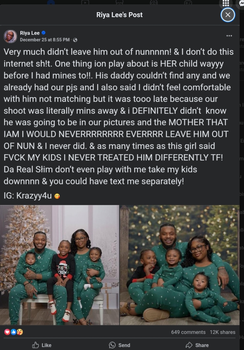 “The MOTHER THAT I AM, I WOULD NEVERRRRRRRR EVERRRR LEAVE HIM OUT OF NUN & I never did. & as many times as this girl said FVCK MY KIDS, I NEVER TREATED HIM DIFFERENTLY TF! Da Real Słim don’t even play with me—take my kids downnnn & you could have texted me separately!”