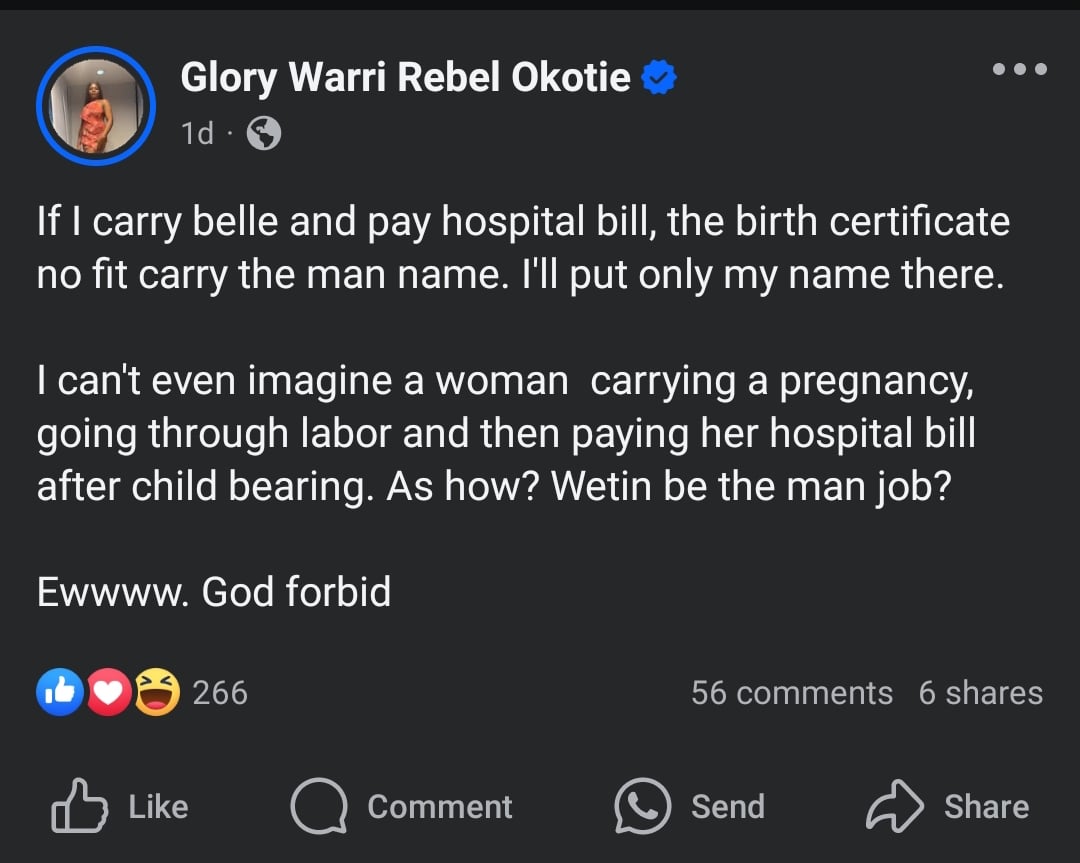 In the post, she shared her intentions ahead of any plans to have a child, explaining, “If I carry belle and pay the hospital bill, the birth certificate no fit carry the man’s name. I’ll put only my name there.”
