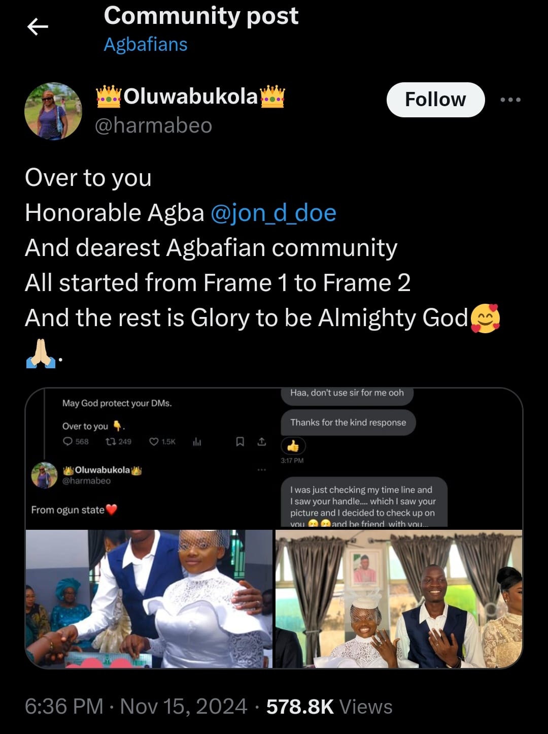 @belovedtimi: “Congratulations are in order. God will sustain you both. Keep you thru thick and thin. He will never leave you both. Happy married life.”