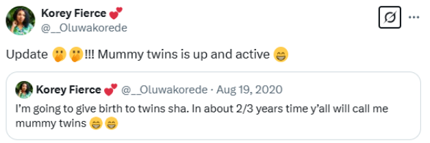 “Update!!! Mummy twins is up and active,” she wrote, celebrating the fulfillment of her long-held desire.