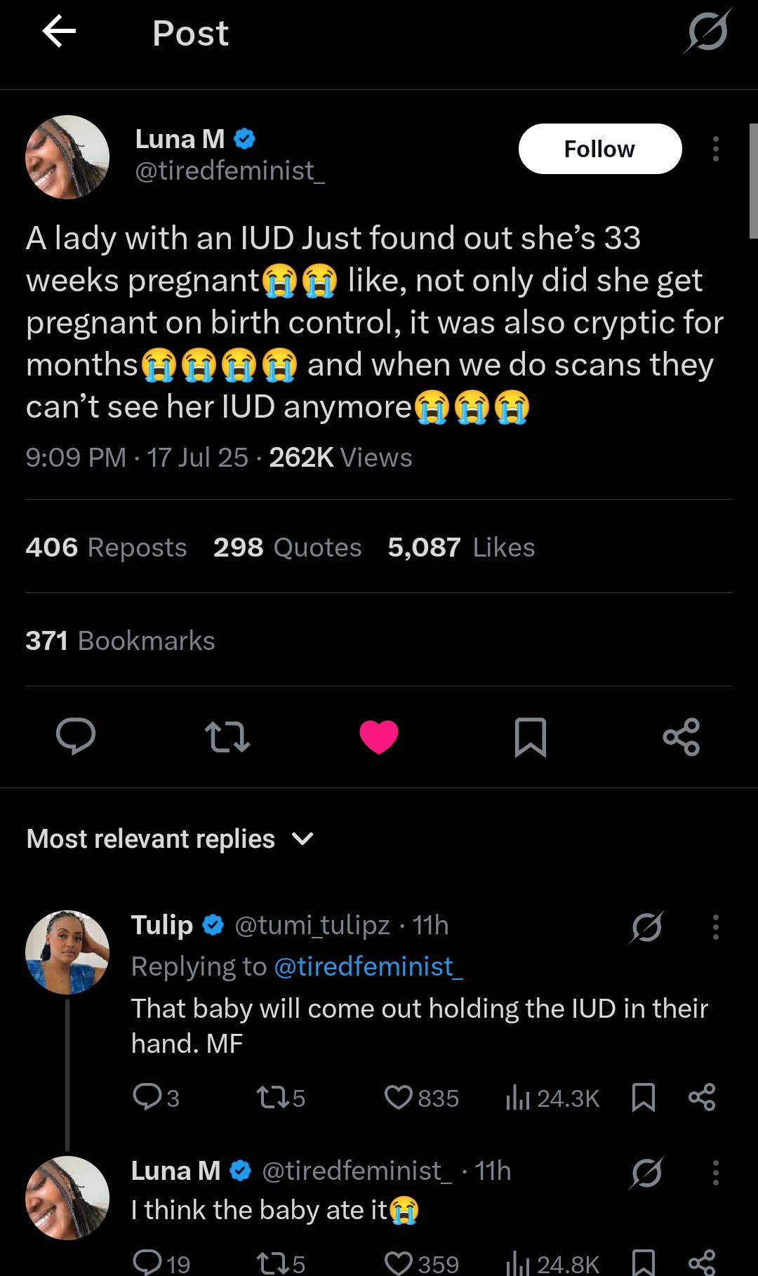 The original post read: “A lady with an IUD just found out she’s 33 weeks pregnant 😭😭 Like, not only did she get pregnant while on birth control, but it was also undetected for months 😭😭😭😭 And during the scan, they couldn’t see her IUD anymore 😭😭😭.”
