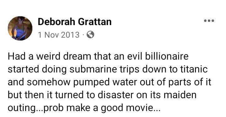 A woman identified as Deborah Grattan made a Facebook post on November 1, 2013, revealing a dream about an “evil billionaire” who started doing submarine trips down to the Titanic.