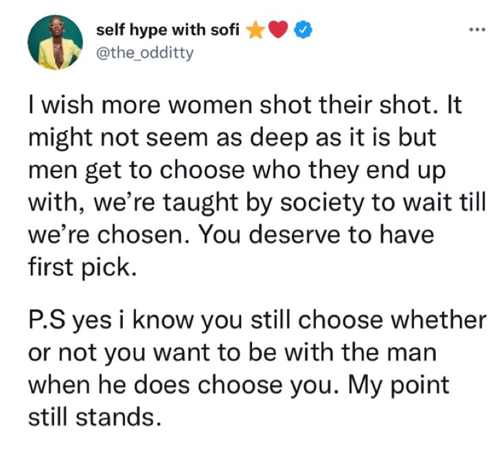 I wish more women shot their shot. It might not seem as deep as it is but men get to choose who they end up with, we’re taught by society to wait till we’re chosen. You deserve to have first pick.