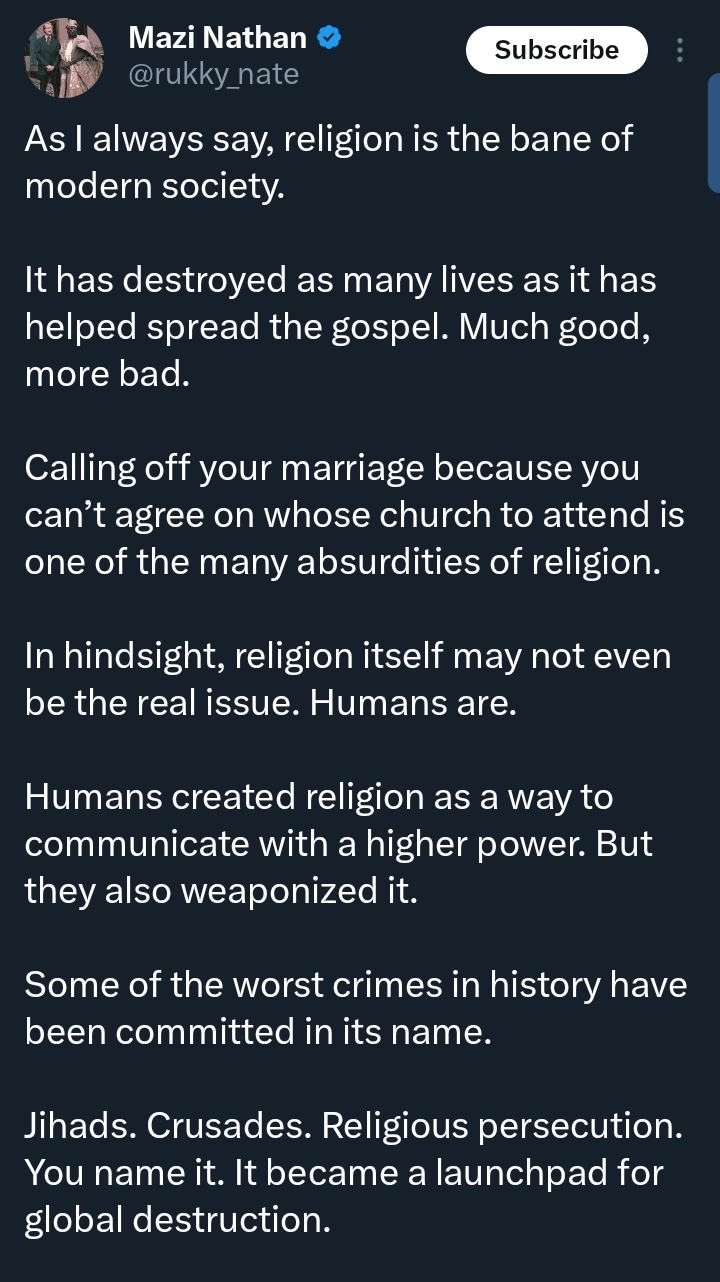 In a post that quickly gained attention, he argued that religion has “destroyed as many lives as it has helped spread the gospel,” adding that while it has done some good, the negative impact is far greater.