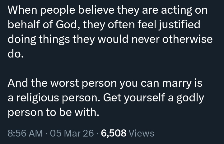 He concluded with a warning to those considering marriage, stating, “The worst person you can marry is a religious person. Get yourself a godly person to be with.”
