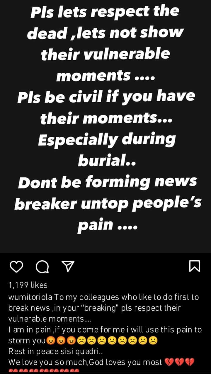Taking to her Instagram page, she urged her colleagues to show respect for the deceased and refrain from sharing his family’s vulnerable moments.