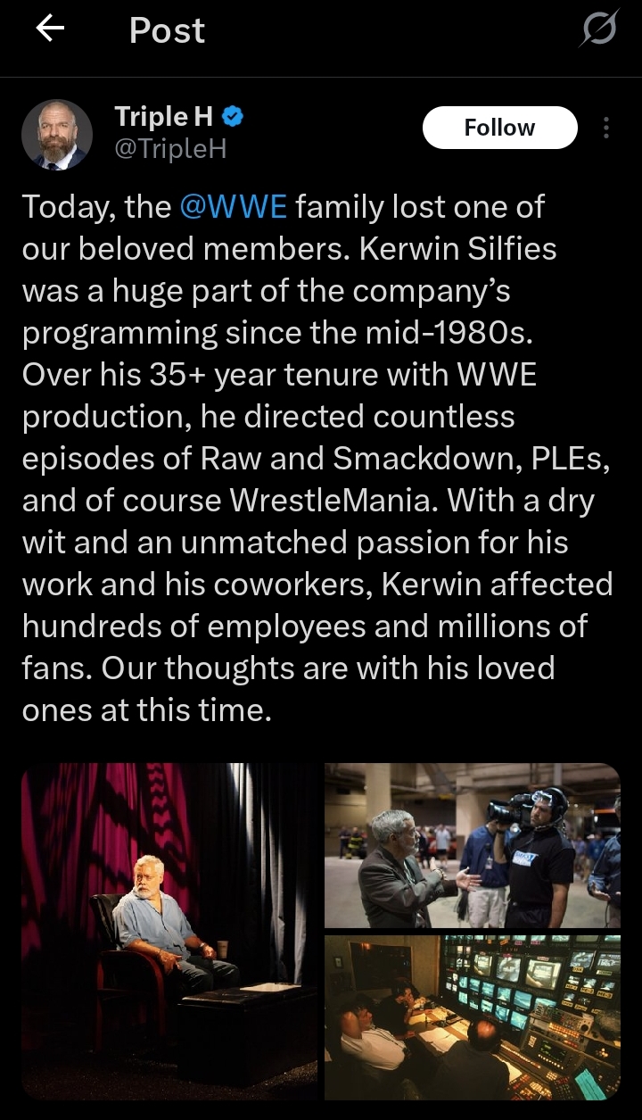“Today, the @WWE family lost one of our beloved members. Kerwin Silfies was a huge part of the company’s programming since the mid-1980s. Over his 35+ year tenure with WWE production, he directed countless episodes of Raw and Smackdown, PLEs, and of course WrestleMania. With a dry wit and an unmatched passion for his work and his coworkers, Kerwin affected hundreds of employees and millions of fans. Our thoughts are with his loved ones at this time”, His tweet reads.