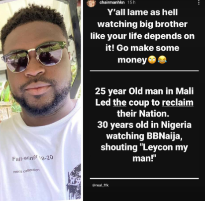 “25 year old man in Mali led the coup to reclaim their nation. 30 years old in Nigeria watching BBNaija shouting ”Leycon my man!”