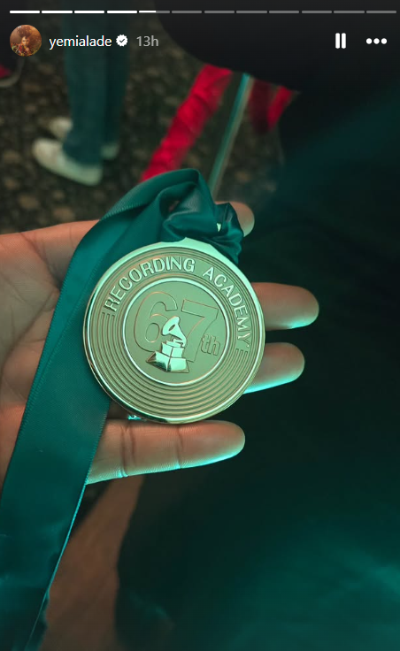 Yemi Alade took to her Instagram page to share a photo of the medal she received at the Special Merit Awards Ceremony and Nominees Reception for the 67th Annual GRAMMY Awards in Los Angeles.