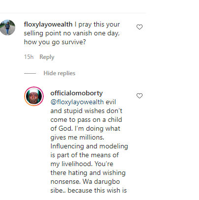“evil and stupid wishes don’t come to pass on a child of God. I’m doing what gives me millions. Influencing and modeling is part of the means of my livelihood. You’re there hating and wishing nonsense. Wa darugbo sibe.. because this wish is never going to come to pass.”