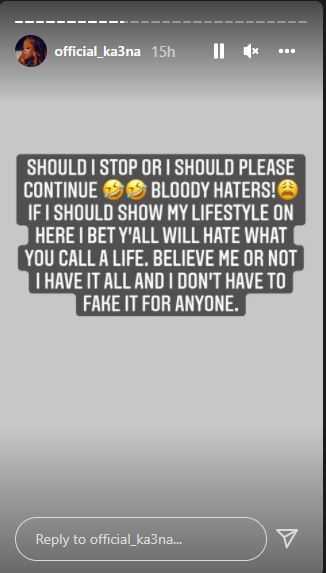“Should I stop or should please continue. Bloody haters! If I should show my lifestyle on here I bet y’all will hate what you call a life. Believe me or not I have it all and I don’t have to fake it for anyone,” she wrote.