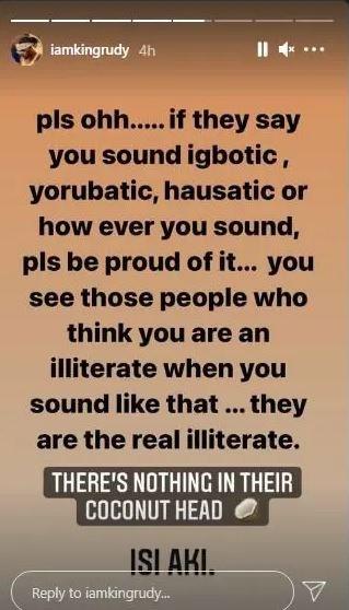 “Pls ohh…If they say you sound igbotic, yorubatic, hausatic or however you sound, pls those people who think you are an illiterate when you sound like that.. they are the real illiterate. There is nothing in their coconut head. Isi Aki”