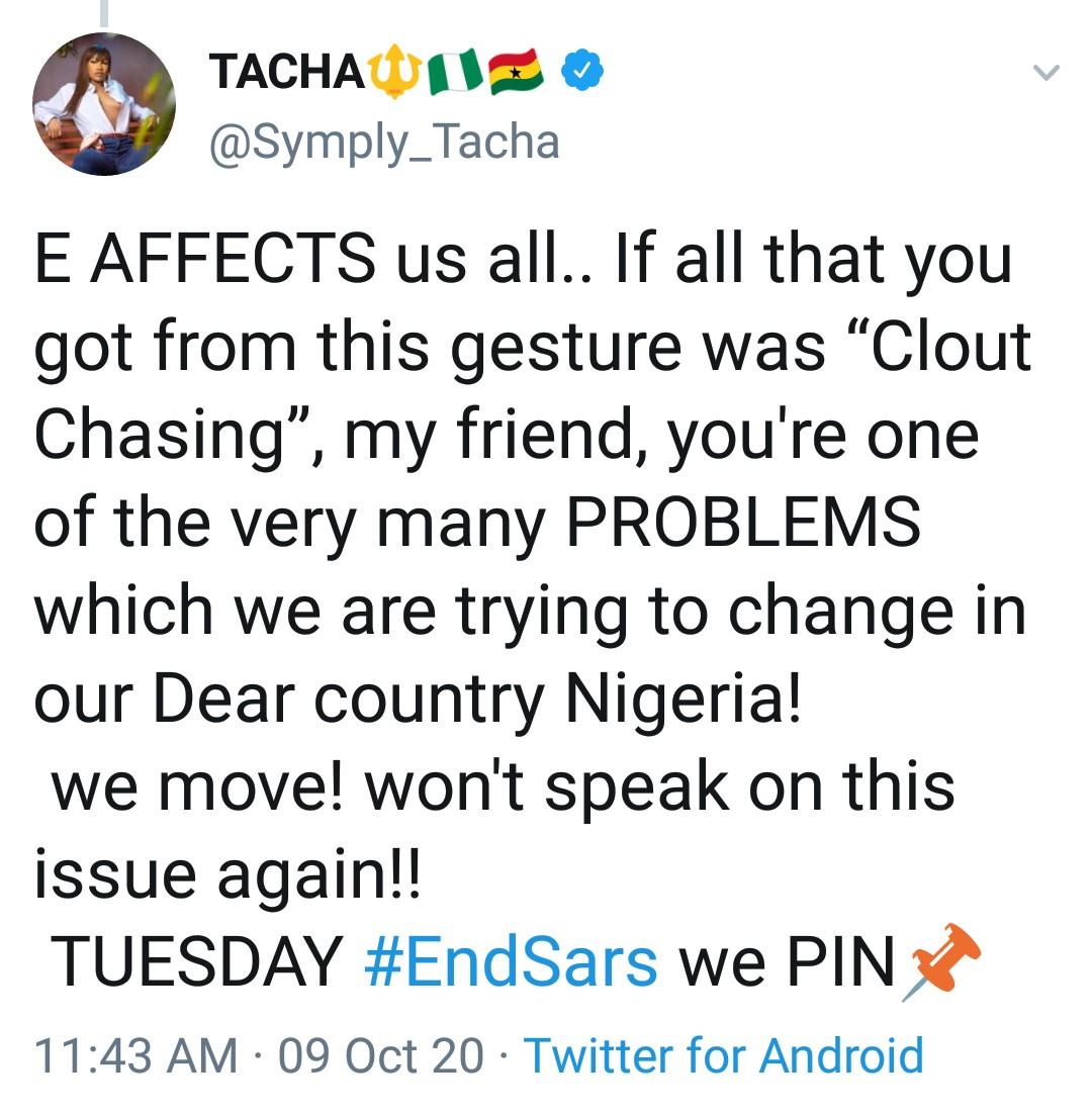 If all that you got from this gesture was “Clout Chasing”, my friend, you’re one of the very many PROBLEMS which we are trying to change in our Dear country Nigeria! we move! won’t speak on this issue again!!TUESDAY #EndSars we PIN”.
