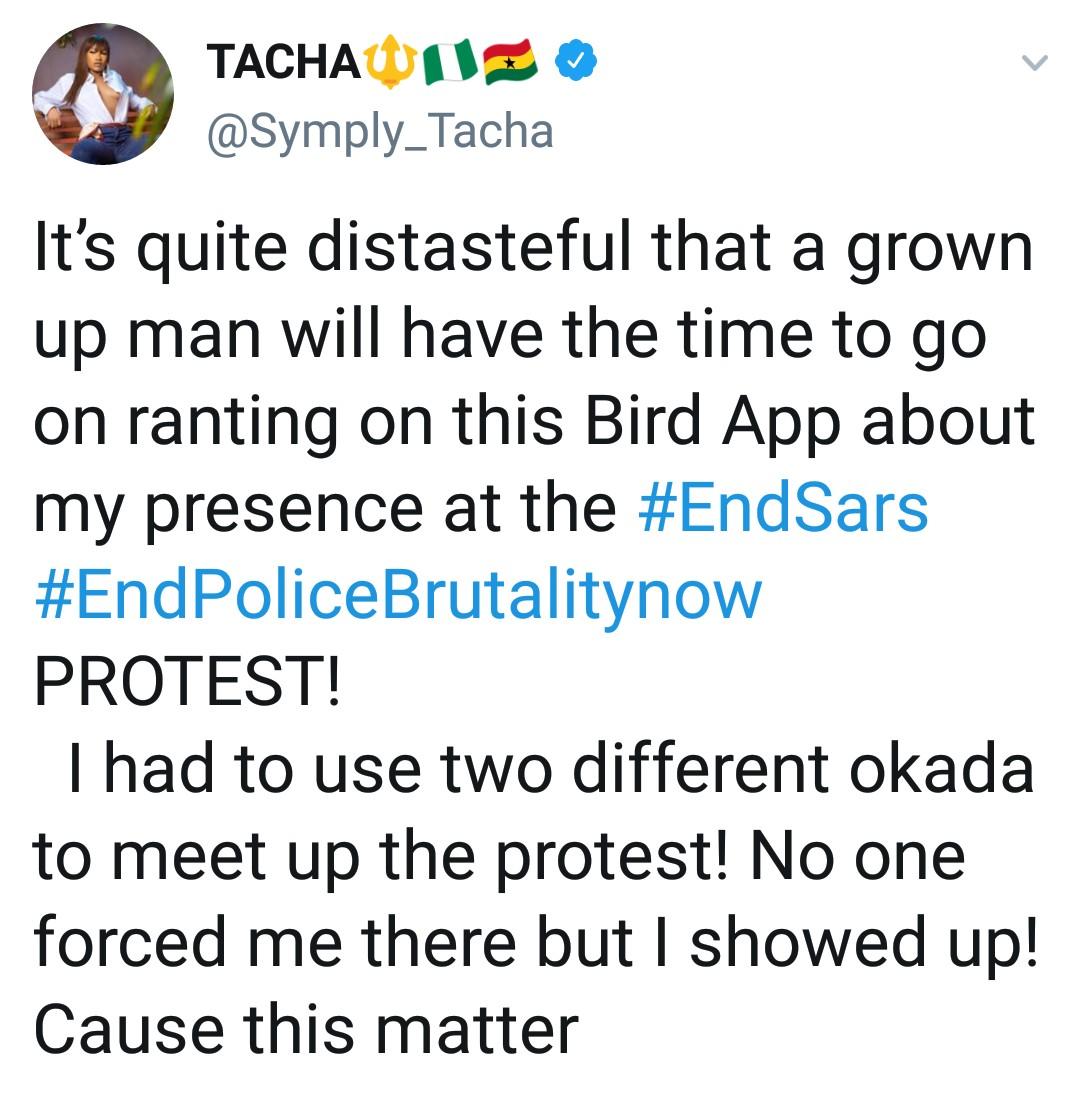 “It’s quite distasteful that a grown up man will have the time to go on ranting on this Bird App about my presence at the #EndSars #EndPoliceBrutalitynow PROTEST!