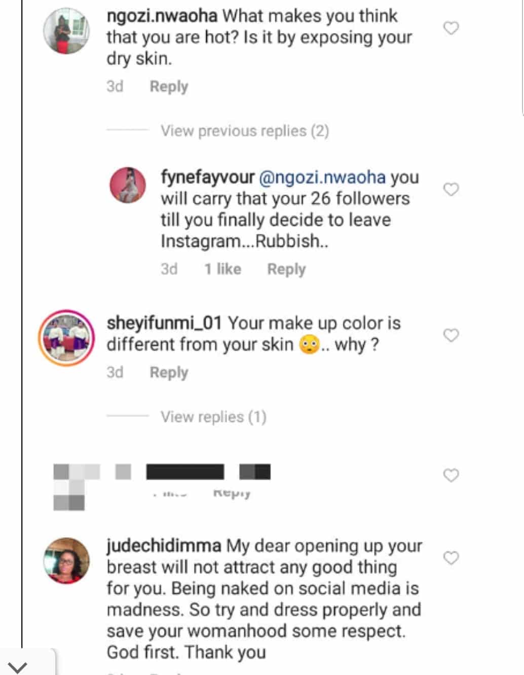 Ngozi wrote: “What makes you think that you are hot? Is it by exposing your dry skin”