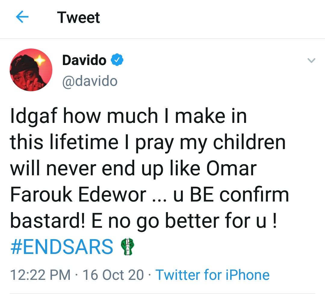 “Idgaf how much I make in this lifetime I pray my children will never end up like Omar Farouk Edewor … u BE confirm bastard! E no go better for u ! #ENDSARS”