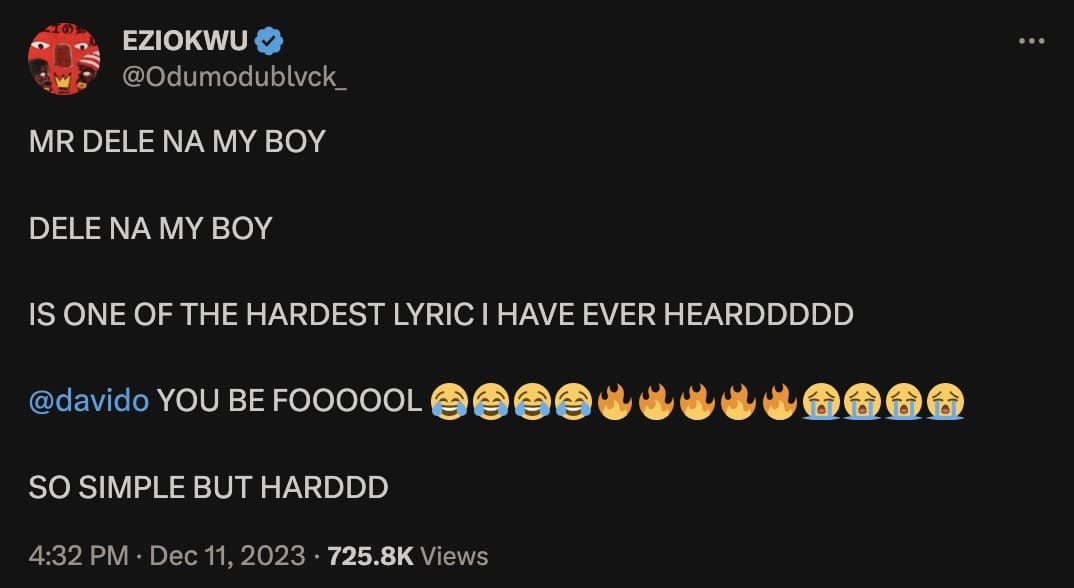“MR DELE NA MY BOY. DELE NA MY BOY. IS ONE OF THE HARDEST LYRIC I HAVE EVER HEARDDDDD. @davido YOU BE FOOOOOL 😂😂😂😂🔥🔥🔥🔥🔥😭😭😭😭. SO SIMPLE BUT HARDDD,” he wrote.