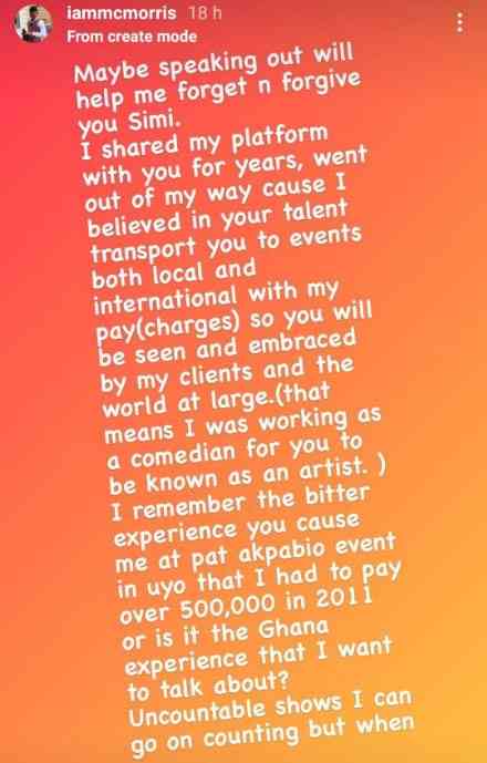 Comedian, MC Morris has shown up on social media to accuse the popular songstress, Simisola Kosoko better known as Simi of snubbing him after she attained stardom in the Nigerian entertainment industry.