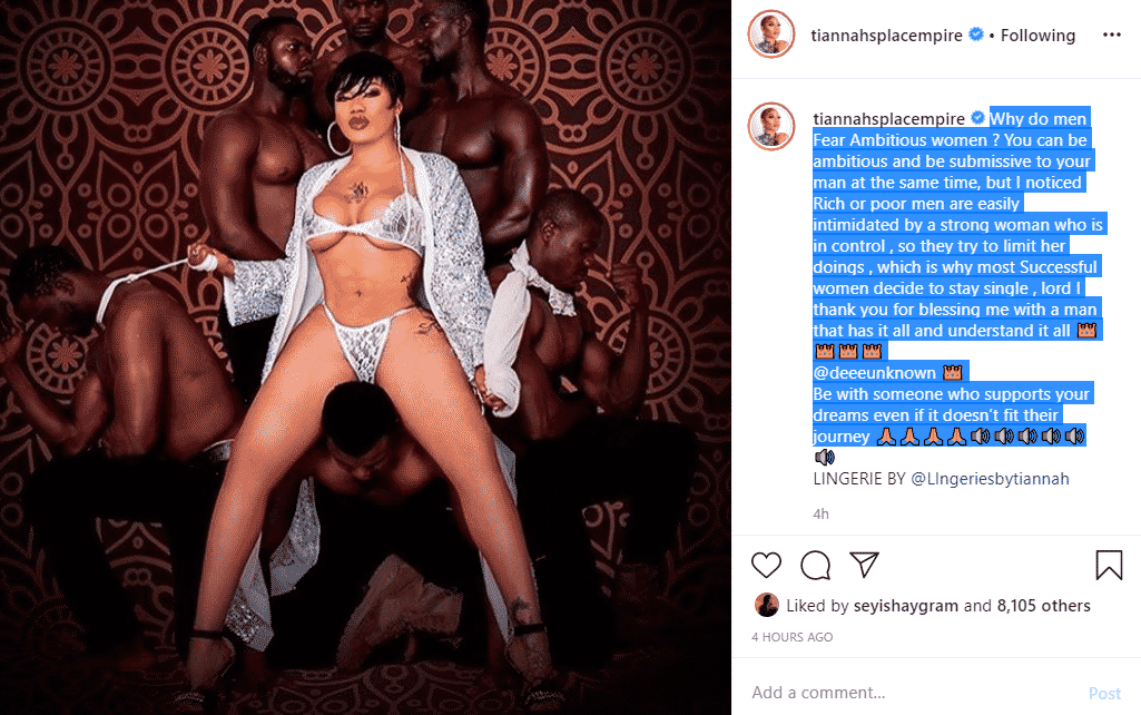 “Why do men Fear Ambitious women ? You can be ambitious and be submissive to your man at the same time, but I noticed Rich or poor men are easily intimidated by a strong woman who is in control , so they try to limit her doings , which is why most Successful women decide to stay single , lord I thank you for blessing me with a man that has it all and understand it all ????