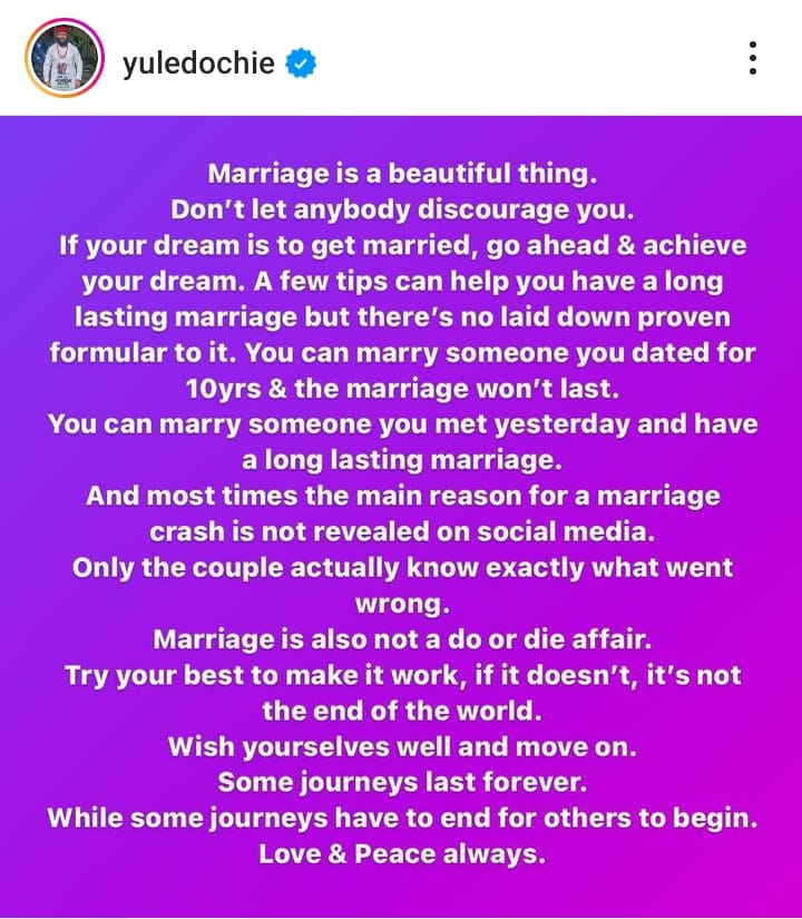 Speaking on marriage, Yul Edochie noted that a person can be in a relationship with another for a decade and the union wouldn’t last. While marriage between people who just met might last a lifetime.