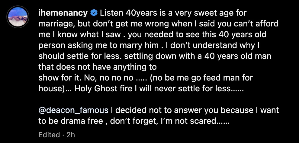 She wrote, “Listen, 40 years is a very sweet age for marriage, but don’t get me wrong when I said you can’t afford me. I know what I saw. You needed to see this 40-year-old person asking me to marry him. I don’t understand why I should settle for less… Holy Ghost fire, I will never settle for less!”