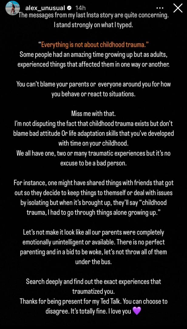 “You can’t blame your parents or everyone around you for how you behave” – Alex Unusual slams people who use ‘childhood trauma’ as excuse for their bad behavior