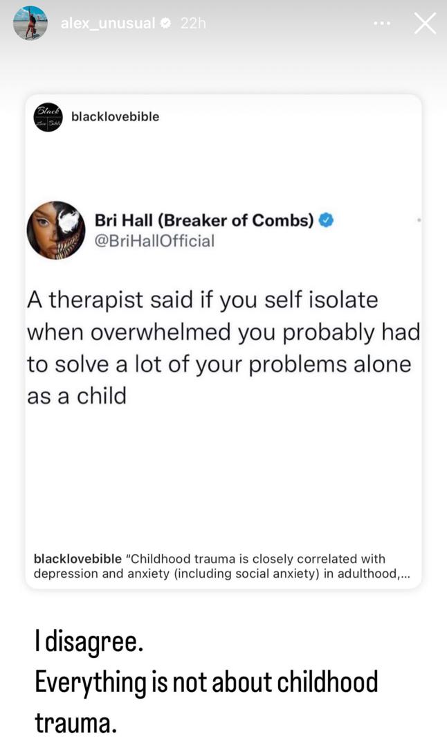 Alex had previously rebutted an assumption of a therapist who stated that self-isolation when overwhelmed, could imply that a person faced a large number of struggles alone as a child.