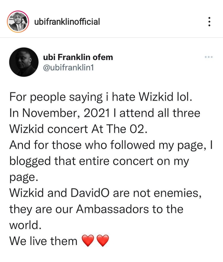 Allaying their fears, Ubi stated that he attended all wizkid’s O2 Arena shows the year before.