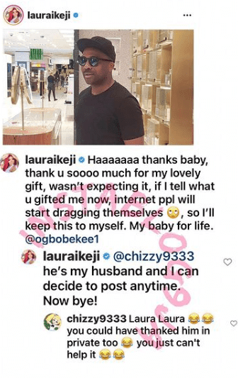 Laura Ikeji responded to the jab and she wrote, “He’s my husband and I can decide to post anytime Now bye.”