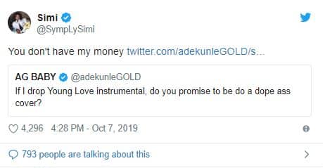 Nigerian celebrity couple Adekunle Gold and Simi have yet again displayed their sense of humour and goofiness on Twitter, with the latter saying the former cannot pay her dues.