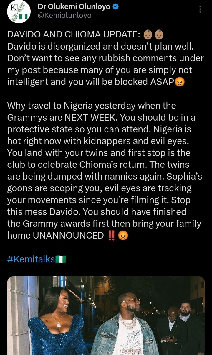 Kemi Olunloyo responded to this on her X handle, describing Davido as a disorganized person who does not plan effectively.