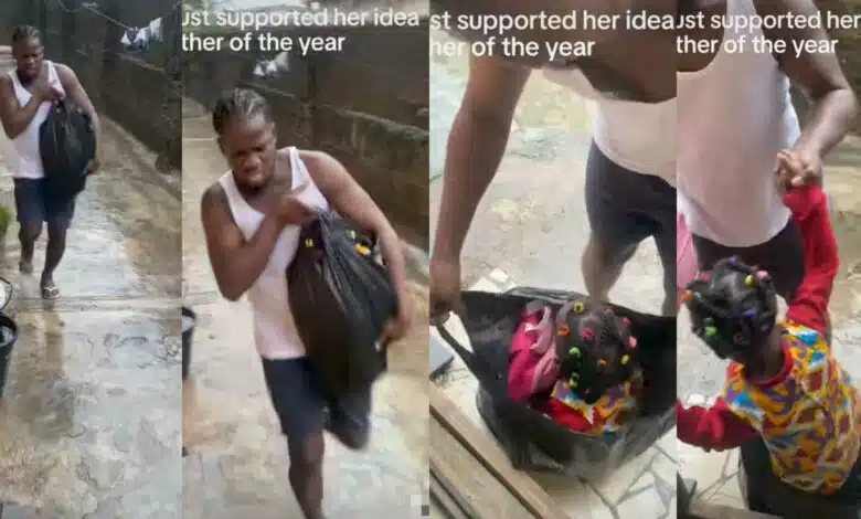 “You for explain tire if police catch you” – Man carries little daughter in nylon bag to protect her from rain