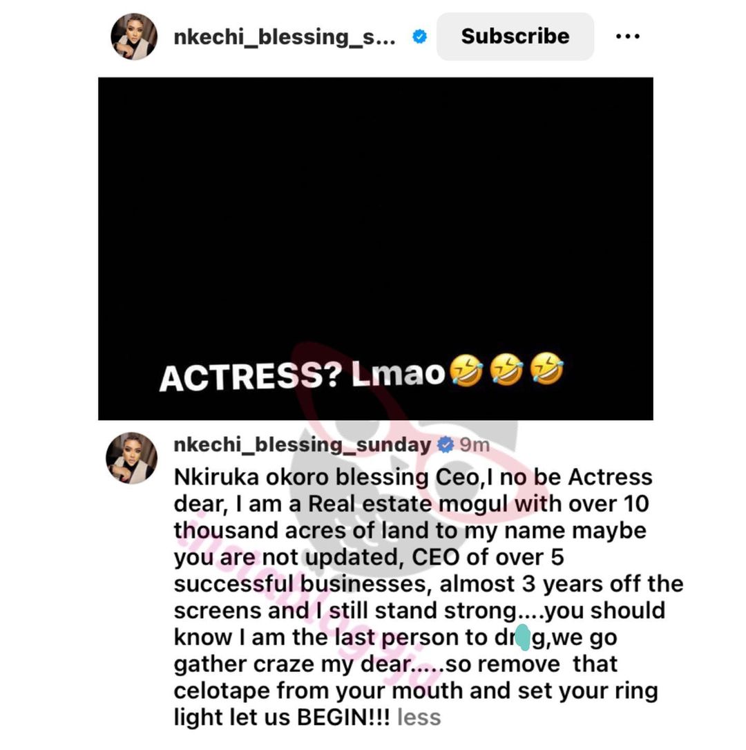 “Nkiruka okoro blessing Ceo,| no be Actress dear, I am a Real estate mogul with over 10 thousand acres of land to my name maybe you are not updated, CEO of over 5 successful businesses, almost 3 years off t screens and I still stand strong….you shoul know I am the last person to dr g,we go gather craze my dear…..so remove that celotape from your mouth and set your rin light let us BEGIN!!!”