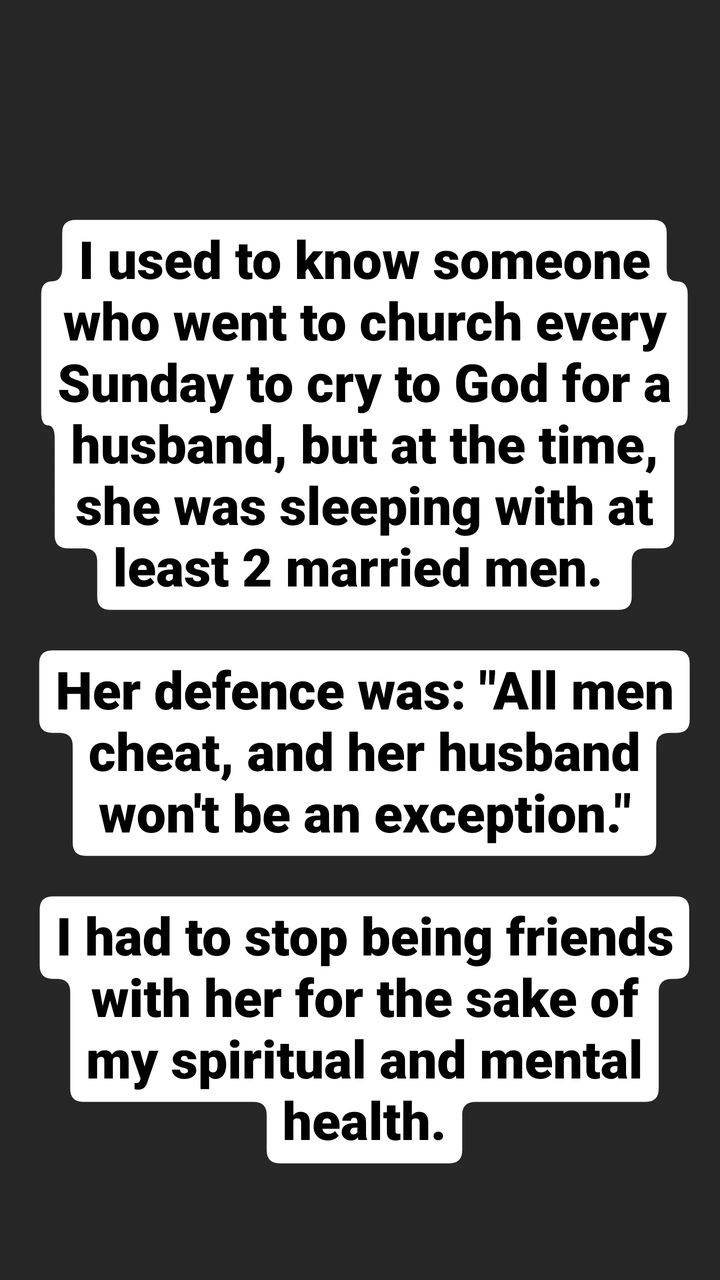 She further narrated how she cut off from someone who went to church every Sunday to cry to God for a husband but at the same, was sleeping with two married men with the defense that all men must cheat and her husband won’t be an exception.