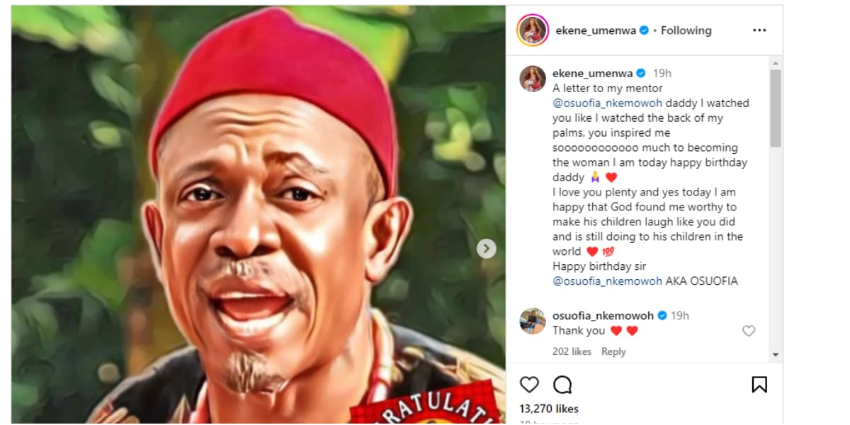Ekene Umenwa recognized the impact the veteran actor, Nkem Owoh has made on her life, especially through his acting career.