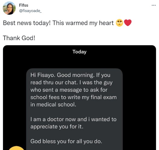 A lady identified on the bird app, Twitter as @fisayoade_ recently showed off the appreciation message she got from a man she helped by paying his school fees.