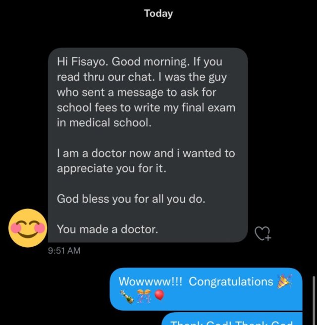 “Hi Fisayo. Good morning. If you read thru our chat. I was the guy who sent a message to ask for school fees to write my final exams in school.