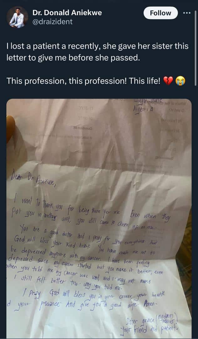 A doctor identified as @draizident on the microblogging platform, X expressed heartbreak as he disclosed the letter handed to him by the sister of his late patient.