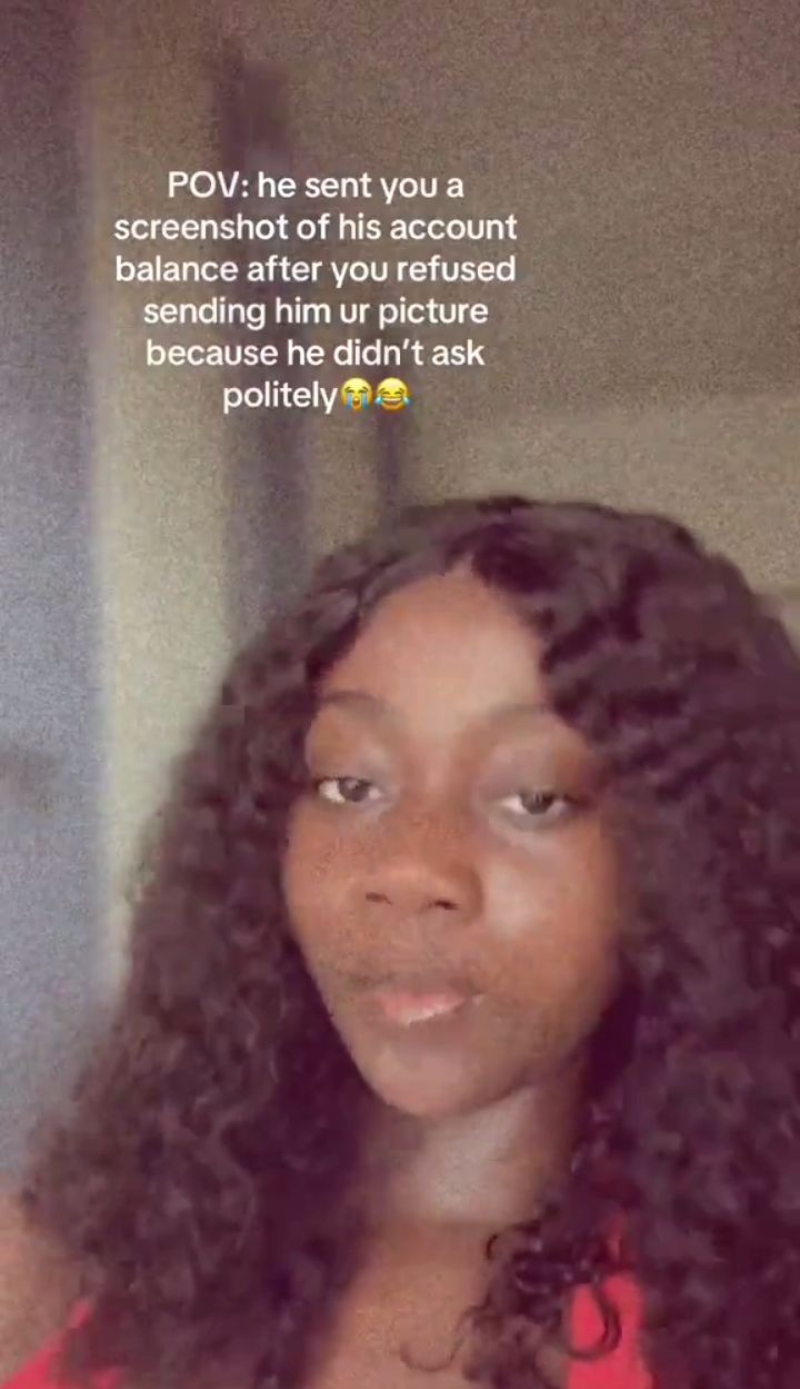 “POV: He sent you a screenshot of his account balance after you refused sending him your picture because he didn’t ask politely”, The video’s caption reads.