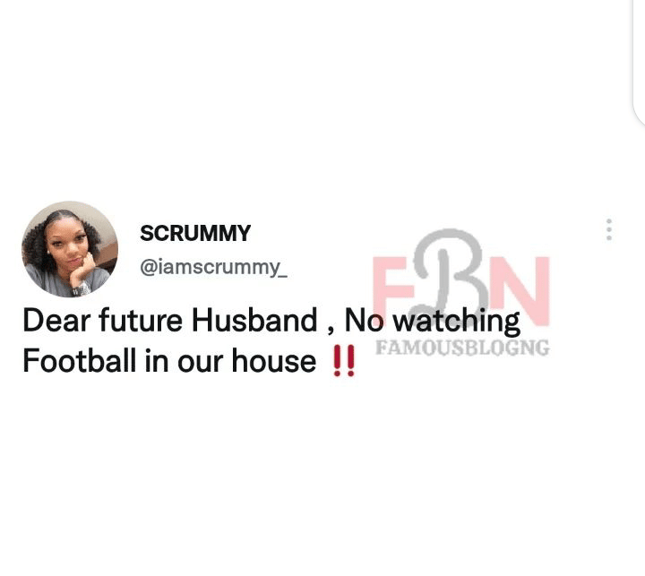 A young lady identified as @iamscrummy on Twitter has warned her future husband against football.