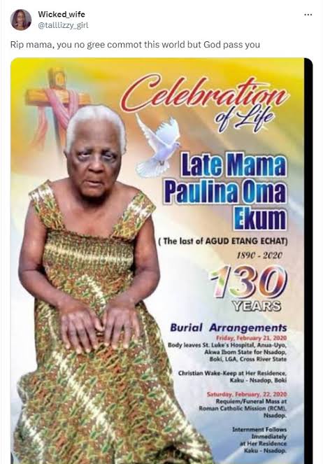 The mother, known as Mama Paulina Oma Ekum, died after 130 years on earth and will be buried in Cross Crivate State, according to the celebration of life pictures.