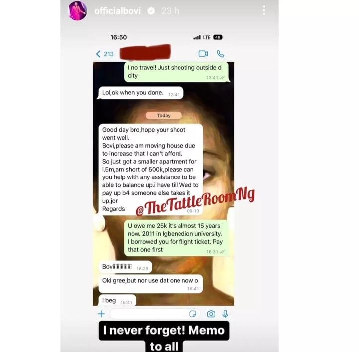 Sharing a screenshot of his chat with his friend via his Instagram page, Bovi also sent out a memo to other debtors in his life, stating that he has not forgotten the debt.
