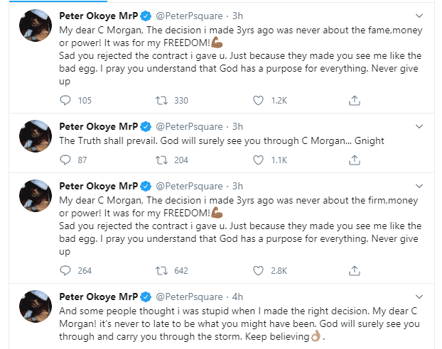 Reacting to Cynthia’s disclosure, Peter Okoye revealed that he decided to severe all ties with his elder brother and twin brother Paul Okoye 3 years ago, to be free.