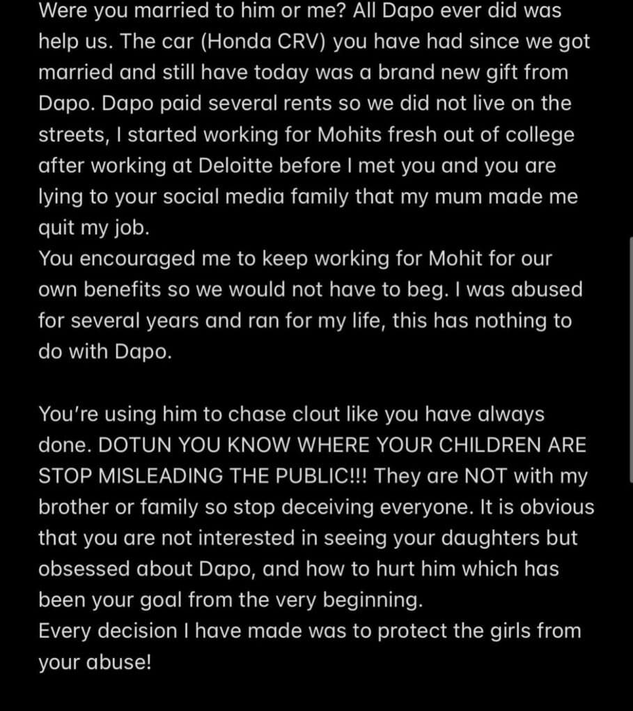 It is obvious that you are not interested in seeing your daughters but obsessed about Dapo, and how to hurt him which has been your goal from the very beginning. Every decision I have made was to protect the girls from your abuse!”