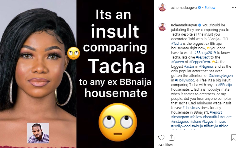 “You should be jubilating they are comparing you to Tacha despite all the insult you decorated Tobi with in BBnaija… ??#Tacha is the biggest ex BBnaija housemate right now, ?you dont have to watch #BBnaija2019 to know Tacha, lets give #respect to the #Queen of #PepperDem. ?As the biggest #actor in #Nigeria, and as the only popular actor that has ever gotten the attention of @chrissyteigen in #Hollywood, ✈️i feel its a big insult comparing Tacha with any ex #BBnaija housemate, ?Tacha is nobodys mate when it comes to greatness, or my people, did you hear anyone complain that Tacha used minimum wage insult to sew #christmas dress for any housemate in BBnaija?”