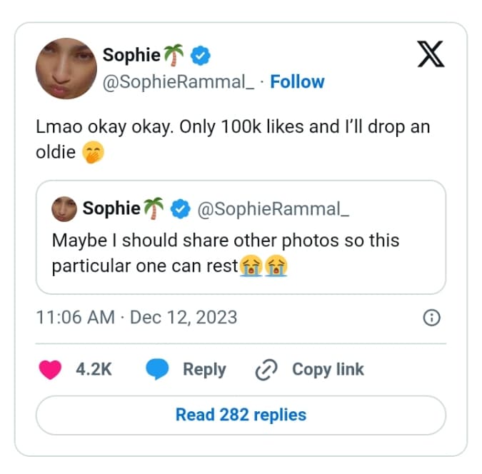 In a follow-up post, Sophie laid down a condition for sharing her throwback photos with Wizkid, stating that she would only do so if she could garner 100k likes on her post.