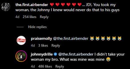 In response, Johnny commented, “@the.first.airbender I didn’t take your woman my bro. What was mine was mine 😂”.