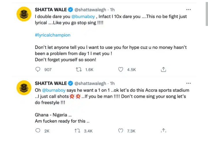 In a swift reaction, Shatta Wale, who understood Burna Boy’s words to mean a freestyle battle, quickly responded saying, “Oh @burnaboy says he want a 1 on 1 ..ok let’s do this Accra sports stadium ..I just call shotsCollision symbolCollision symbol…If you be man !!!! Don’t come sing your song let’s do freestyle !!! Ghana – Nigeria … Am fucken ready for this.”